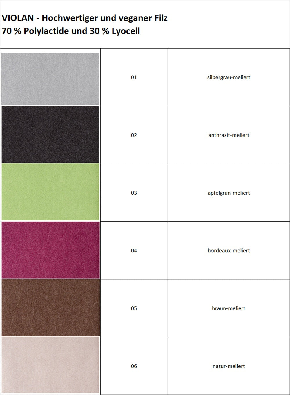 - VIOLAN - vegetable felt: 70% polylactide and 30% lyocell