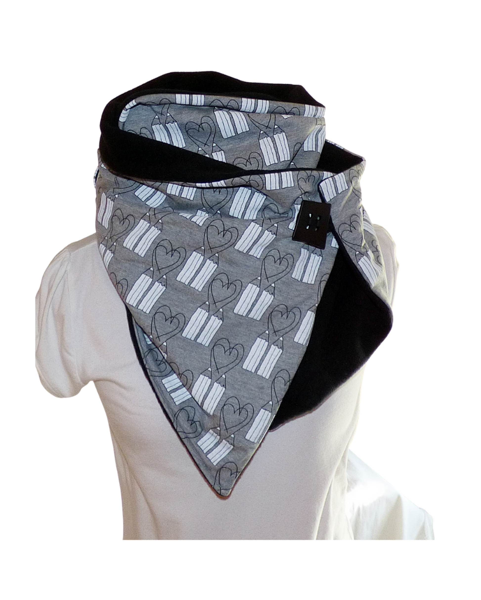 It's made of gray cotton jersey with a heart pattern. It's lined with black fleece.