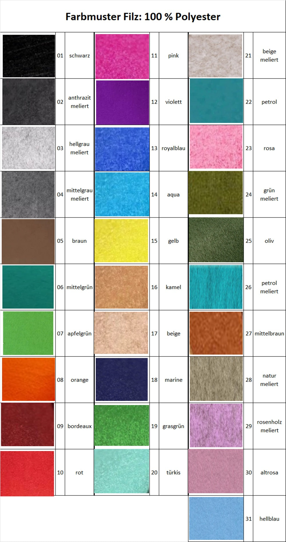 Falls bei Sitzkissen aus Polyesterfilz versehentlich Farben aus der VIOLAN-Farbkarte gewählt werden, setzen wir die Bestellung in einer passenden Farbe aus Polyesterfilz um.