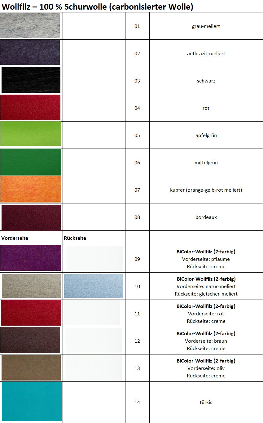 - Zwei frei wählbare Filzfarben aus Wollfilz oder VIOLAN